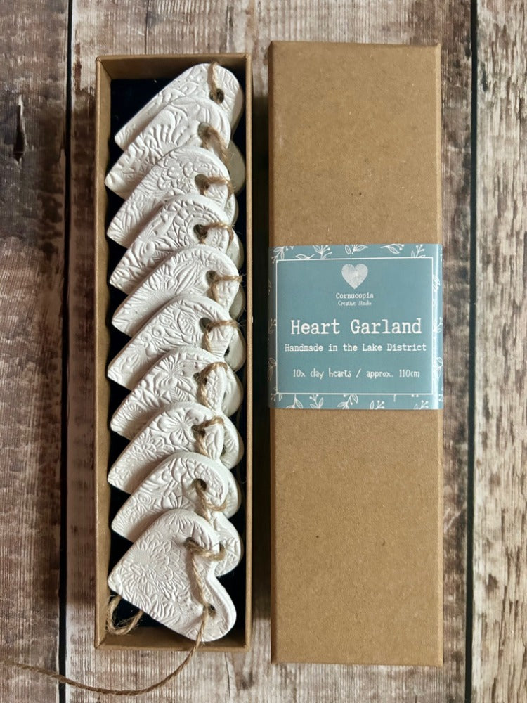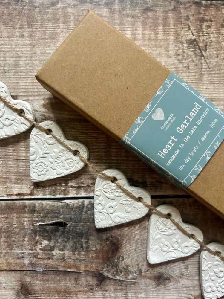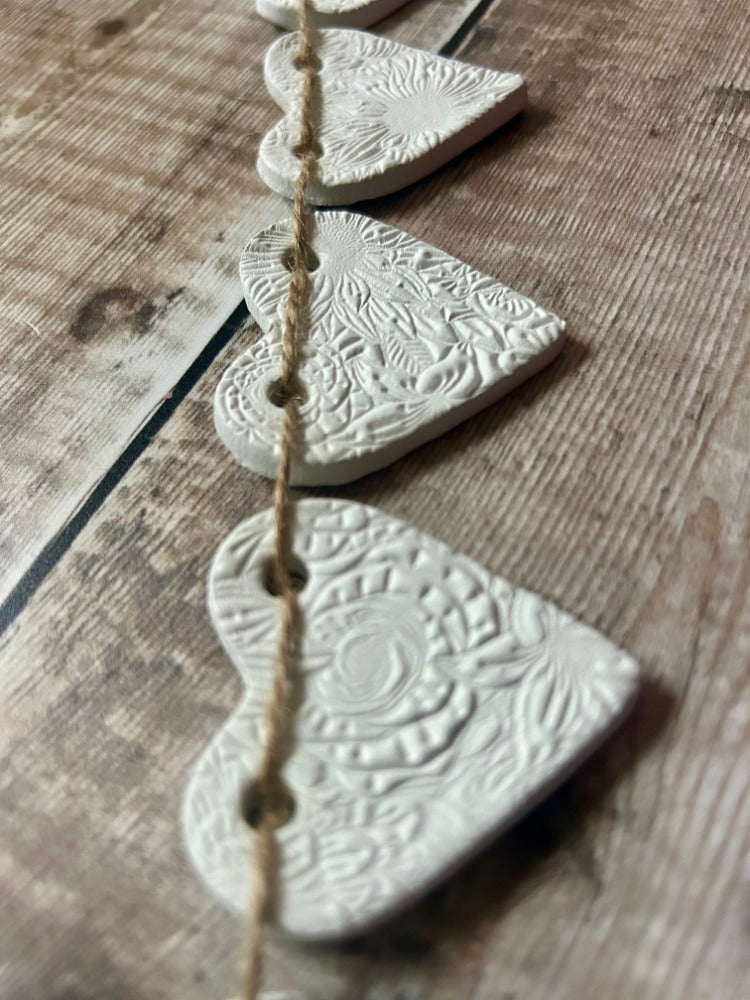 This beautiful clay heart garland consists of 10 individually made hearts, each embossed with a floral pattern, making beautifully rustic year-round home decor, or a delightful addition to your Spring range.